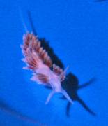 As the image at the right shows, they are nearly invisible, not yet having acquired their pigmentation, which is harvested from the Aiptasia anemones they consume.