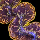 The Rhodactis mushroom is one of the easiest corals to keep in the aquarium. It grows and multiples relatively fast in comparison to most other corals all while displaying some of the most vivid colors imaginable. Rhodactis are differentiated by other mushroom corals in that they have small tentacles or "hair" that covers the top of the coral sometimes giving them the common name of "Hairy" mushrooms. This coral is known to rarely eat small crustaceans and fish whenever proper lighting or food requirements are not met for a long period of time. It is advised to keep this coral at least an inch or two from its neighbors as it contains minor stinging sweepers. Rhodactis corals can tolerate a wide variety of lighting and flow conditions but typically do not withstand high flow areas of the aquarium like most other mushroom corals. They will survive in a multitude of different water conditions and is considered one of the best beginner corals in the hobby.