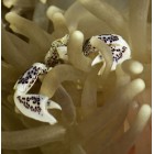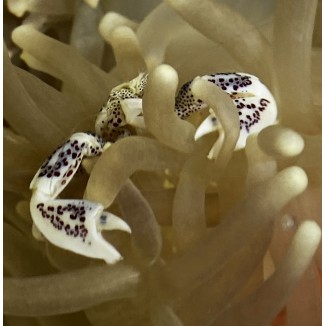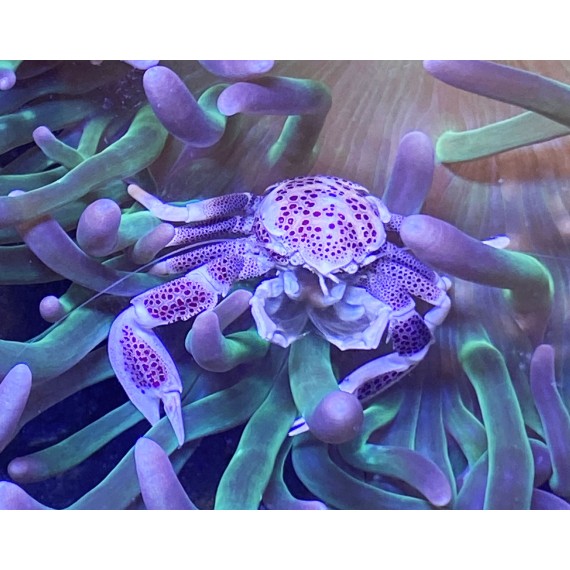 The Anemone Crab, Neopetrolisthes maculatus, has white or light cream-colored body with various light purple to brown spotting. They are peaceful, reef safe, and easy to care for. The crab may sometimes be aggressive towards other crabs and can be particularly territorial should it feel threatened. The Anemone Crab feeds primarily on algae, detritus, and will scavenge for other foods.