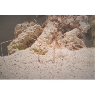 The Arrow crab, also known as the Spider crab has extremely long legs. It is called an arrow crab because of the shape of the body and head. They can reach anywhere from 6-10 inches. The crab has been known to attack crustaceans and may even attack slow moving fish. All crabs are opportunistic feeders and if the insufficient food is present they may pick at mushrooms or polyps for food. They can however been beneficial for eating bristle worms which some consider pests. Like most inverts they are very sensitive to copper based medications.