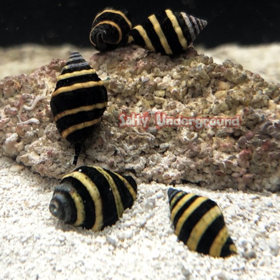 Our Bumblebee snails, Engina mendicaria, have a spiraling shell with yellow stripes and a black background. These small, colorful, hardy snails are known for eating uneaten meaty fish food or carrion. Some sources report bumblebee snails may eat bristle worms and Vermited snails.