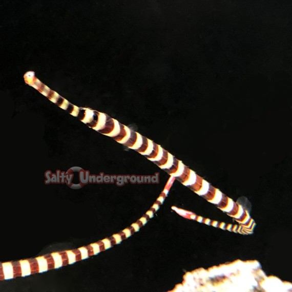 The Banded Pipefish is a type of reef pipefish. They usually do not come in contact with the substrate. These pipefish are a white and black banded body with an alluring bright red tail. Due to their food eating habits they are not for a beginner aquarist. They require being fed live foods such as copepods and live baby brine. You may be able to train them to eat very small frozen mysis and nutramar ova. These Pipefish can reach up to 7 inches and will require an aquarium of at least 20 gallons. Due to their peaceful easy-going nature, they should be housed with other docile fish like firefish, dragonettes, seahorses and small gobies. They are not reef safe as they can be easily hurt by stinging corals, inverts, large shrimp, and anemones.