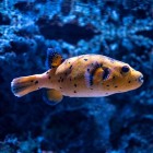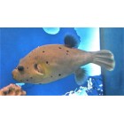 The Dog Face Puffer is a semi aggressive fish, and may nip at smaller fish. They can reach up to 13 inches. An aquarium of at least 150 gallons with plenty of room to swim would be ideal. When threatened this puffer will inflate to twice its size. Parts of their body are poisonous when consumed. The puffer's diet consists of meaty foods like squid, krill and clams. They may also eat majanos from rocks. Hard shell inverts help to keep their teeth filed down. The Puffer is a possible longtime companion to any aquarium with a life span of 10-15 years.