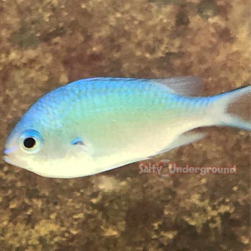 The blue/green reef Chromis (Chromis viridis) is a mainstay in the saltwater hobby. They are a schooling fish and will require an aquarium of at least 30 gallons with plenty of swimming room. They can be kept singly or in groups. Groups are best in odd numbers. Their diet will consist of mysis, brines, and other meaty foods. They may take high quality flake and pellet foods.