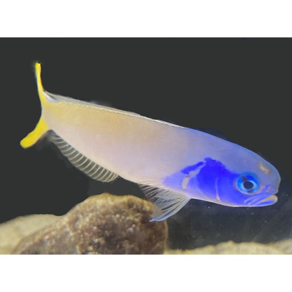 The Bluejaw Tile Goby has an elongated, white and yellow body with a very striking blue head. The body, fins and eyes also have a slight blue tint that further adds to the appeal of this species. It is a peaceful fish that will make a beautiful addition to any community aquarium. They can reach up to 6 inches and will require an aquarium of at least 75 gallons with at least 3 inches of substrate. A tight fitted lid is recommended as they tend to jump. Their diet consists of mysis, brines, and other meaty foods. They may also take high quality flake and pellet food.