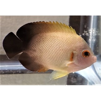 The Half Black Angelfish, like its name is half black and half pearled in coloration. It is an active open water swimmer. It can reach up to 4 inches and will require an aquarium of at least 70 gallons with plenty of swim room as well as some rock work to hide and forage from. They are peaceful with other fish but can get aggressive with other angels. They are not considered reef safe as they nip at soft and stony corals.