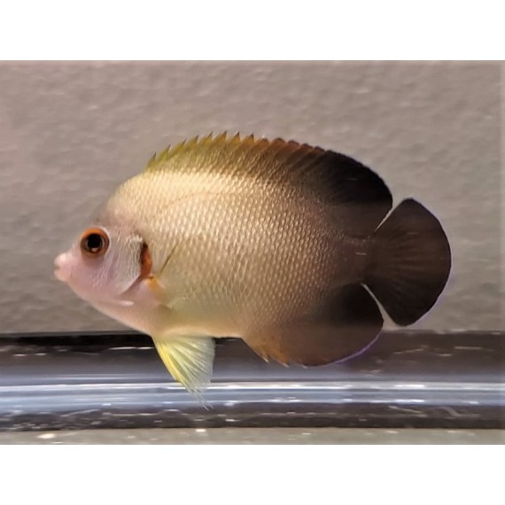 The Half Black Angelfish, like its name is half black and half pearled in coloration. It is an active open water swimmer. It can reach up to 4 inches and will require an aquarium of at least 70 gallons with plenty of swim room as well as some rock work to hide and forage from. They are peaceful with other fish but can get aggressive with other angels. They are not considered reef safe as they nip at soft and stony corals.