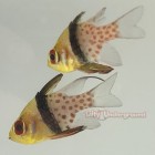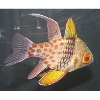Pajama Cardinals are a schooling fish. They do best in odd number groups but can be kept singly. Cardinals hang out in the open water column of your tank. They can reach up to 4 inches and will require an aquarium of at least 20 gallons with plenty of swim room. Pajama Cardinals should be kept with other peaceful tankmates. Their diet consists of mysis, brines, and other meaty foods. They may even take high quality flake and pellet foods.