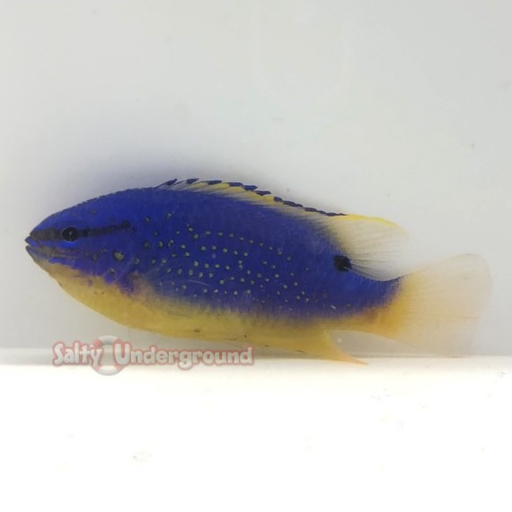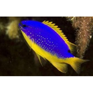 The Fiji Blue Devil Damsel is like most damsels an aggressive fish. This fish will require an aquarium of at least 30 gallons with plenty of rock for hiding. They can get up to 3 inches. This fish should not be put with other damsels like itself. Fiji Blue Devel Damselfish are reef safe. Their diet consists of mysis, brines, other meaty foods, flakes, and pellets.