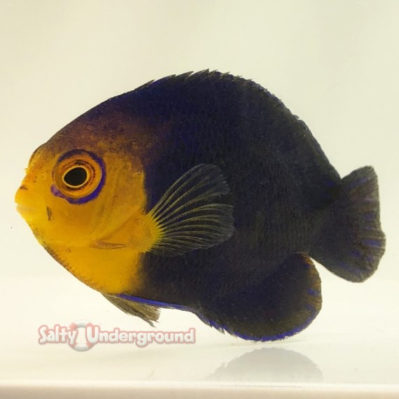 The Pygmy Cherub Angelfish is a semi aggressive fish with beautiful blue and orange coloring. They can reach up to 3 inches and will require an aquarium of at least 55 gallons with plenty of rock for hiding and foraging. They are not considered reef safe as they could nip and soft and stony corals. There should never be more than one pygmy angel in the same aquarium unless they are a pair. Their diet consists of marine algae, spirulina, mysis, brines, and will take high quality flake and pellet foods.