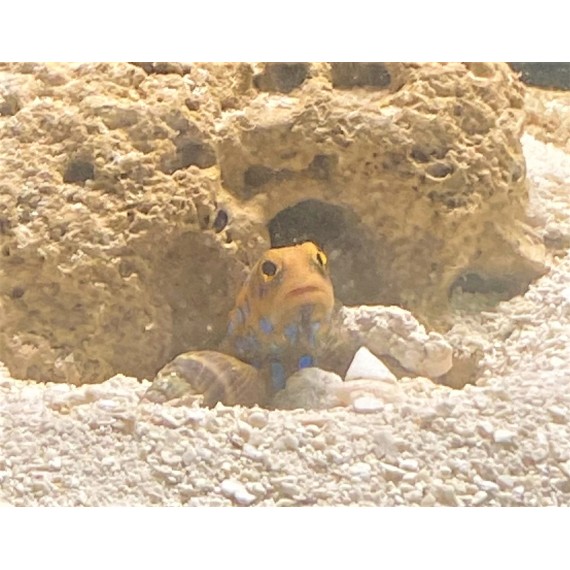 The Blue Spot Jawfish can grow up to 4 inches and will require at least 30 gallon or larger aquarium with plenty of live rock and a layer of fine to moderately sized sand substrate to sift through. Substrate layer should be at least 3 inches for this burrowing fish. A tight-fitting lid is necessary to prevent them from jumping out of the aquarium. It will rarely become aggressive towards other fish, but is will fight with its own kind unless they are a mated pair. Their diet consists of a variety of mysis, brines, and other meaty foods. It is suggested they be fed at least 2-3 times a day.