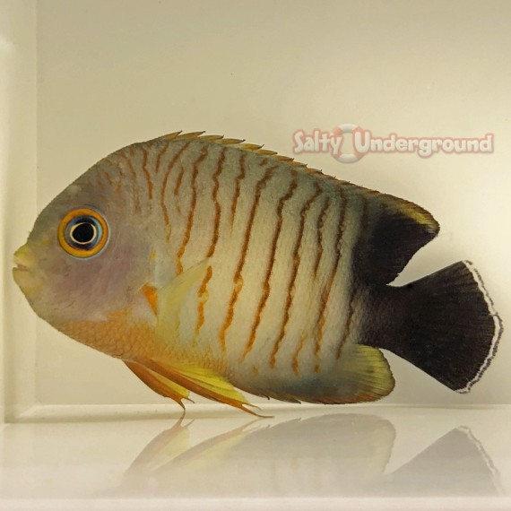 The Eibli Angelfish or also known as the Red Stripe Angelfish, a semi-aggressive dwarf angelfish. They require at least 70 gallons or larger aquarium with live rock for hiding and grazing. They are peaceful with other fish but should be the only dwarf angelfish in smaller aquariums. Place with caution as they may occasionally nip at sessile invertebrates and clam mantles. It is extremely difficult to breed in an aquarium, and there are no distinguishing characteristics that help differentiate males from females. Their diet consists of Spirulina, marine algae, mysis, and other meaty foods.