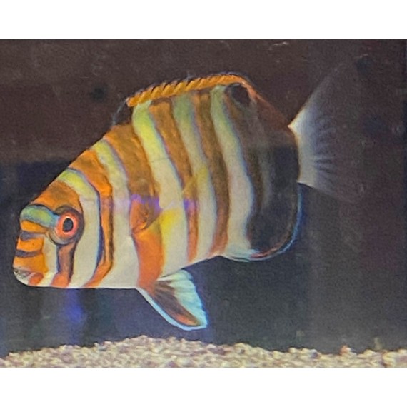The Harlequin Tusk Wrasse originates from the reefs of the Indian Ocean. They are a wonderful fish for any aquarium. These fish are typically shy when at a small size but will in time gain personality and confidence as they mature. The diet should include vitamin enriched frozen mysis shrimp, vitamin enriched frozen brine shrimp, and other meaty foods along with a high-quality marine flake and marine pellet food.