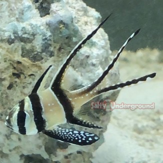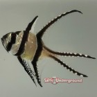 Banggai Cardinal, also known as Kaudern's Cardinal, has become one of the most popular marine aquarium species. These gorgeous silver and black Cardinalfish are found in remote islands of Indonesia and are known to hide within the spines of long-spine sea urchins. This species is known to be a mouthbrooder. The male holds the fertilized eggs in his mouth until full development and releases them as juveniles. Banggai Cardinals have a spawn size of anywhere from 12 to 50 fry, which develop in the male's mouth for 20-24 days. They will spawn every 30 days and it is not uncommon to observe this in home aquarium. The juveniles emerge ready to take newly hatched brine shrimp. For these reasons, this is a species many home aquarists have bred and reared. Their diet consists of mysis, brines, and other meaty foods. It may take even high quality flake and pellet foods.