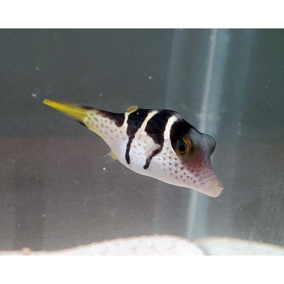 The Valentini Puffer is also referred to as the Saddled Toby. The puffer is a peaceful fish. They eat different kinds of meat including shrimp, krill and clams. Eating small invertebrates helps to keep their beak filed down. The maximum size is 4 inches. As their name suggests, they will puff up when they feel threatened or are being netted. A minimum aquarium of at least 30 gallons is required.