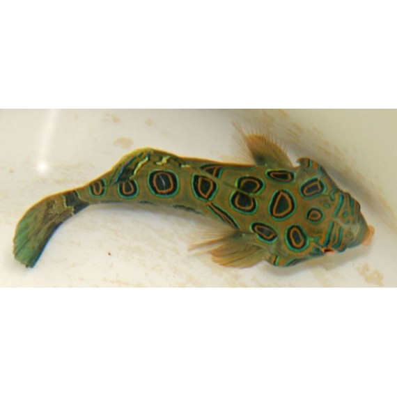 The Spotted Mandarin, also referred to as Target Mandarin, is a member of the family Callionymidae that grows to a maximum length of 3 inches. Spotted Mandarins have light green/yellow bodies with unique turquoise, black and orange eye patterns. Their face masks have beautiful turquoise and orange stripes. Synchiropus picturatus is a peaceful fish that will fare best in the established reef tank with a replenishing copepod population. Choose tankmates carefully to avoid competition for food. Captive bred mandarins will accept a variety of prepared frozen and dry foods upon acclimation to their new tank. They may be offered Nutramar Ova, finely chopped Hikari Frozen Blood Worms, fish roe, frozen or live baby brine shrimp, frozen daphnia. Some have also shown interest in Cyclopeeze. Despite the fact that these are captive bred fish, mandarins are still a challenging fish to feed. A good supply of live pods and live rock is recommended for these fish.