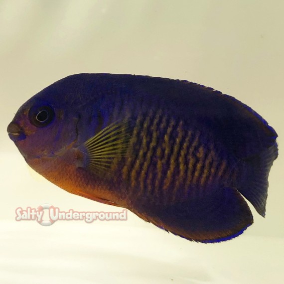 The Coral Beauty Angelfish, has a multi color body with deep blues. It is an active open water swimmer. This fish requires an aquarium of at least 40 gallons or more with ample swimming room. This angelfish is not considered reef safe as it may pick at some corals attempting to get food. Their diet will need to consist of frozen or fresh mysis, shrimp and other meaty foods along with marine algae to keep them healthy.