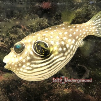 The bold pattern gives the Stars and Stripes Pufferfish its name. They are peaceful fish and will get along with other fish and puffers. They are not reef safe as they will eat inverts as well as corals. Their diet consists of mysis, brines, and other meaty foods. They need clams or something hard shelled to keep their teeth filed down.