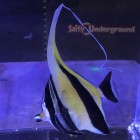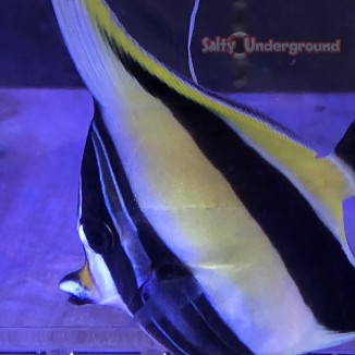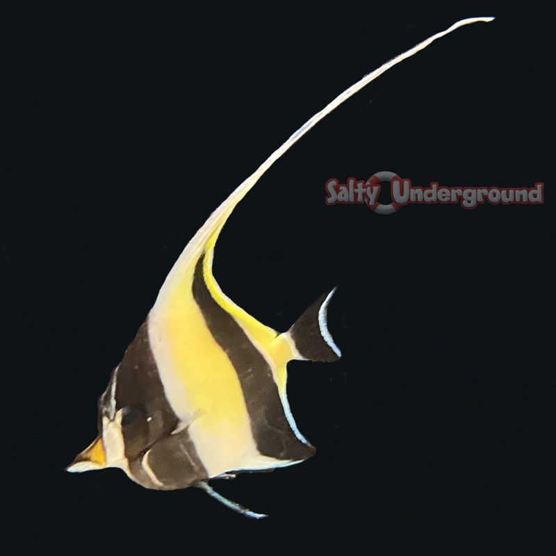 Moorish Idols are a peaceful and graceful addition to the reef aquarium. As they are very social fish they do well with other peaceful tank-mates. They can grow up to 7 inches and will require an aquarium of at least 130 gallons with plenty of swimming room as well as places to forage. The aquarium will need to be a well-established one with plenty of algae and sponge to forage for between meals. They require at least two feedings a day. It is currently eating frozen food. They are peaceful but not considered reef safe since they may pick at corals, sponges and possible small inverts during their foraging.