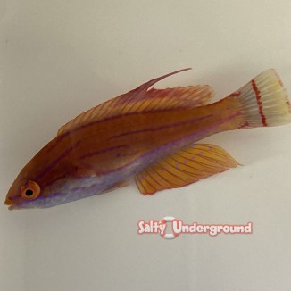 This Carpenter Wrasse is bright red with multi patterns. It is an active open water swimmer and flasher. The size is approximately 3 inches long and is eating a variety of captive foods. This wrasse requires a tank of 55 gallons or more. It is an omnivore and will eat flake or frozen food. This fish is peaceful as long as it is the only fairy, if in a small tank. It is reef safe. Keep this fish in a covered tank as it is known for jumping.