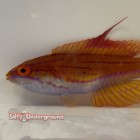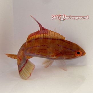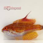This Carpenter Wrasse is bright red with multi patterns. It is an active open water swimmer and flasher. The size is approximately 3 inches long and is eating a variety of captive foods. This wrasse requires a tank of 55 gallons or more. It is an omnivore and will eat flake or frozen food. This fish is peaceful as long as it is the only fairy, if in a small tank. It is reef safe. Keep this fish in a covered tank as it is known for jumping.