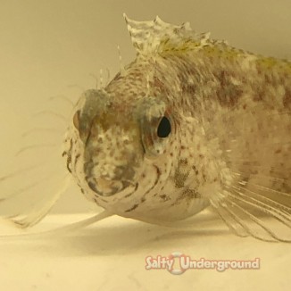 This blenny has unique looks and a fun personality. It has oversized red eyes with a mottled brown with white dot body and yellow fins. It's the typical body shape of the Blenniidae family. This blenny is a peaceful fish as long as not housed with the same type of blenny as they may become territorial. Their diet will consist of marine algae as well as vegetable matter, spirulina, and may take high quality flake and pellet food.