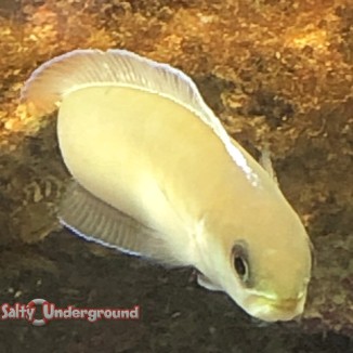 The Dusky Tilefish has an elongated, white, apricot, and gold body. The eyes also have a slight blue tint that further adds to the appeal of this species. It is a peaceful fish that will make a beautiful addition. They can grow up to 5 inches and will need an aquarium of at least 50 gallons with a fitted lid as they are known to jump. They can be in pairs as they usually are in the wild. Their diet consists of brines, mysis, and other meaty foods as well as high quality flakes and pellets.