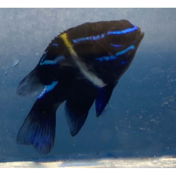 The Blue Velvet Damsel is deep blue with light blue neon markings. These hardy fish require an aquarium of at least 30 gallons or larger. They may be aggressive toward other fish especially other damsels and clownfish. Their diet consists of mysis, brine, and other meaty foods. They will also take high quality flake and pellet food.