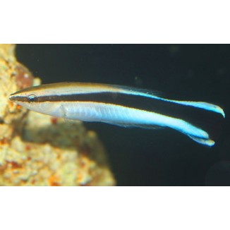 Our African cleaner wrasse, Labroides dimidiatus, also known as the Bluestreak Cleaner Wrasse has a color pattern of blue, black and white horizontal stripes. This fish can grow up to 5.5 inches and will require an aquarium of at least 90 gallons with plenty of swimming room. They are a very active fish and will require multiple feeding a day. This cleaner wrasse will peck at other fish to attempt to clean them. Their diet consists of mysis, brines, and other meaty foods. They may even take high quality flake and pellet foods.