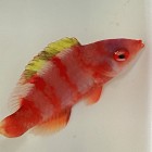 This Yellow Fin Fairy Wrasse is red with blue lines and yellow fin. The fairy requires a tank of 30 gallons or more. They do best with lots of swimming room. This fish is peaceful as long as it is the only fairy if in a small aquarium. Keep this fish in a covered tank as it is known for jumping. Their diet consists of mysis, brine, and other meaty food. They will also take high quality flake and pellet food.